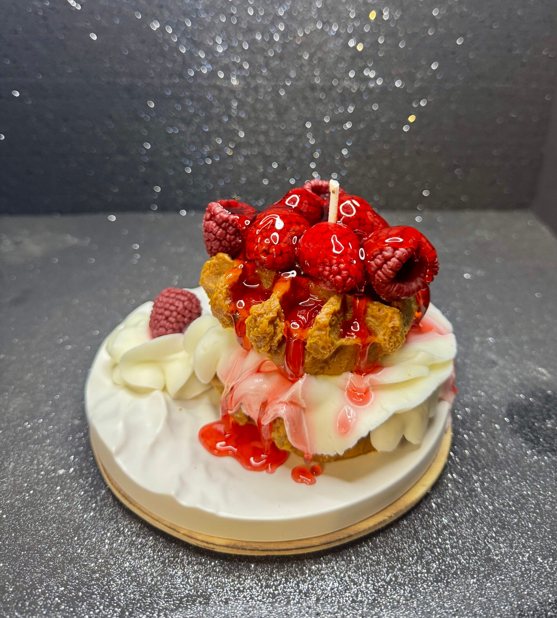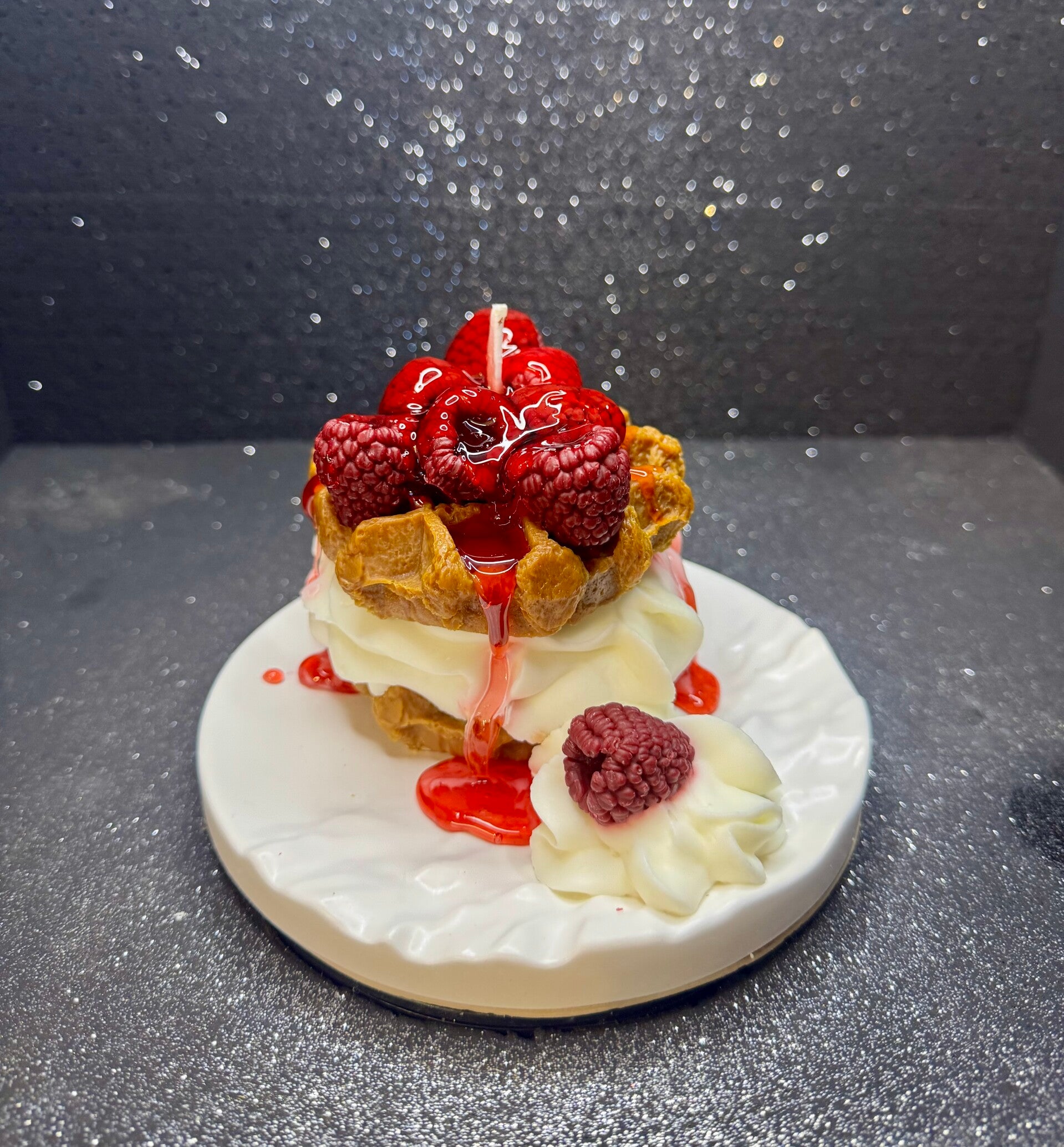 Super lecker aussehende Waffelkerze mit himbeersoße, Sahne und Himbeeren. Sie steht auf dem dazu gehörigen Teller aus Keraflott.